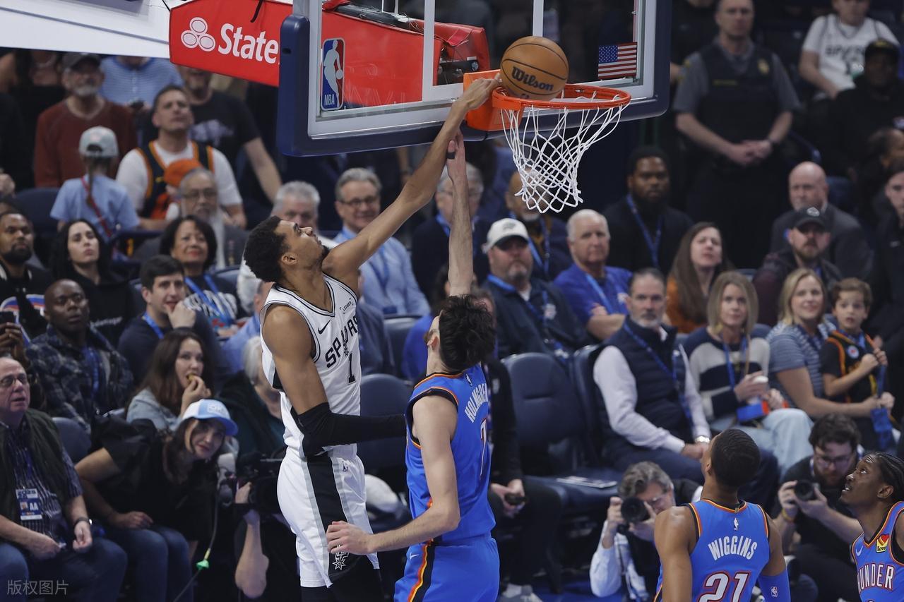 马刺上半场比赛还能与雷霆纠缠,但是下半场风云突变,巴恩斯的持续低迷,卡斯尔的连续失误被雷霆各种打反击一下子就拉开了,马刺4分半钟仅靠技犯罚球拿到1分,雷霆轰14-1直接将末节打成垃圾时间。此役,马刺虽然有5人得分上双,但是无一个得分爆点。得分最高的是卡斯尔,他12中6,3分5中3,罚球7中5,得到20分;其次,文班亚马15中7,得到17分7篮板1盖帽,只用143场达成500盖帽的成就,创下历史第4快纪录;哈珀得到12分,尚帕尼得到13分,福克斯得到14分。
