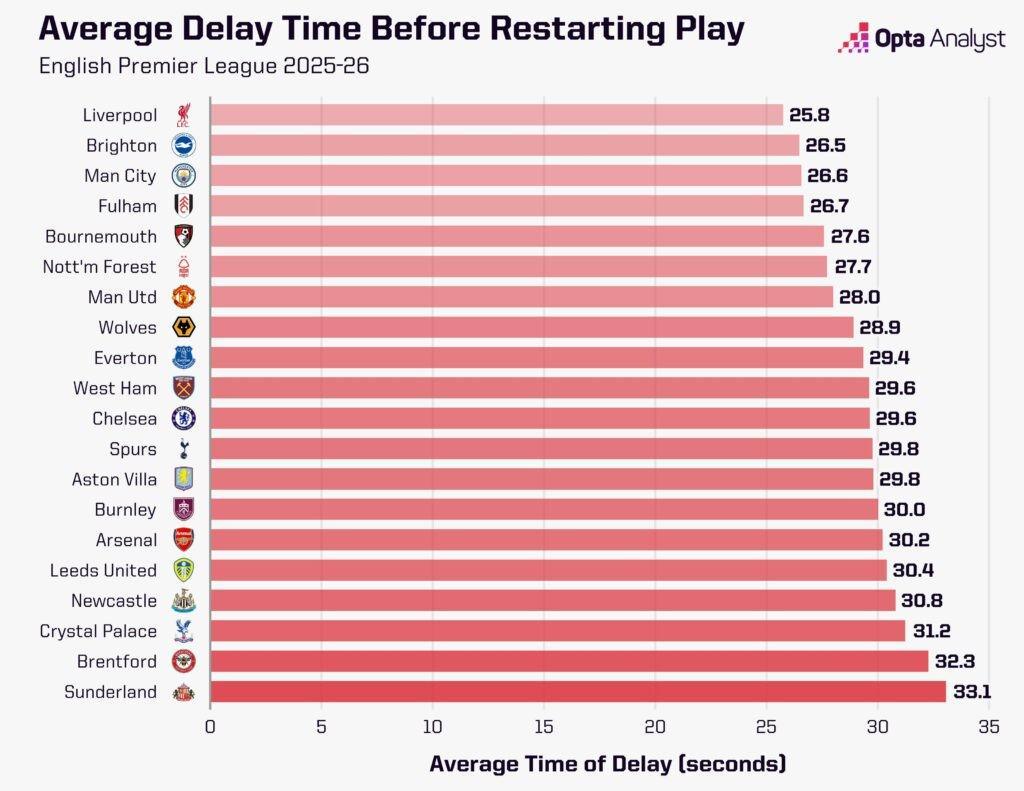 阿森纳59次的拖延次数,显然和1851秒的总拖延时长直接相关。平均下来,他们每次从角球、球门球、界外球和任意球重新开球,需要耗时31.4秒。而在2025-26赛季英超中,共有195次球队重新开球的平均用时超过这一数字。