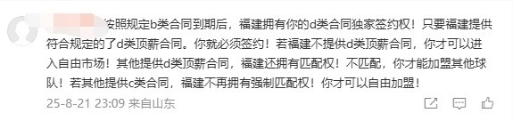 在邹阳的社交媒体评论区,有球迷提出:"根据CBA规则,B类合同到期后,福建队享有D类顶薪独家签约权。若球队提供符合标准的D类顶薪,球员必须签约。只有福建不提供顶薪时,你才能进入自由市场。即便其他球队开出D类顶薪,福建仍享有匹配权,除非他们放弃匹配,你才能转会。若其他球队提供C类合同,福建则没有强制匹配权,届时你可自由加盟。"